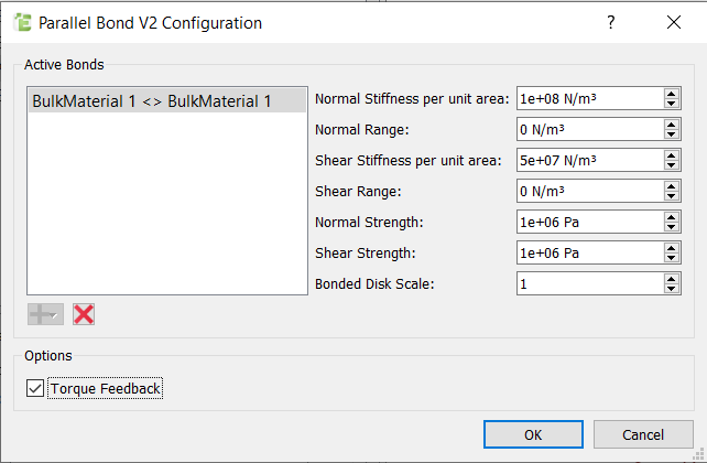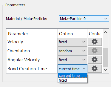 Bonds are created based on two methods - ‘current time’ or ‘fixed’. Once the bond model V2 is selected, these options are displayed in the Factory creating the Bulk Material or Meta-Particles. Current time allows the dynamic creation of bonded materials and fixed time allows the creation of bonded material at one user-defined point in time.