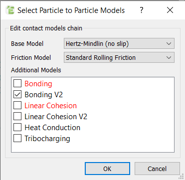 These bond forces/torques are in addition to the Base Contact Model. Since the bonds involved in this model can act when the particles are no longer physically in contact, the contact radius should be set to higher than the actual radius of the spheres. This model may only be used between particles.