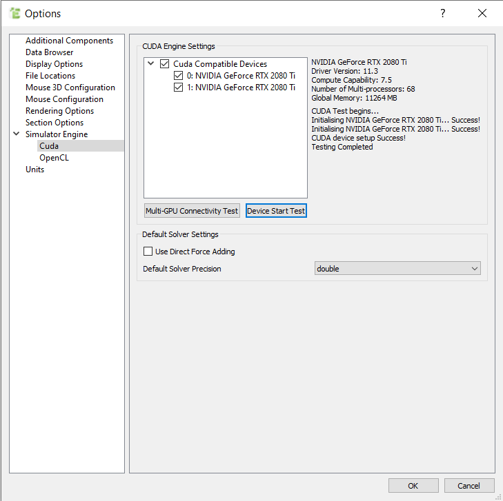 To run the test, go to Tools > Options > Simulator Engine > CUDA. Under the CUDA Engine Settings, select the relevant GPU devices and click on Start test. It should only take a few seconds. If there is more than 1 GPU card in the same machine, you can select which cards to use to run a simulation.