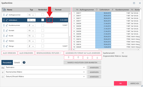 Klicken Sie auf das Symbol für Format bearbeiten neben der zu formatierenden Datums-Spalte: