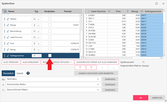 Kreuzen Sie das Feld Verdecken neben der zu verdeckenden Spalte an.