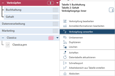 Wenn eine Verknüpfung bearbeitet oder gelöscht werden soll, wählen Sie die entsprechende Option aus der Dropdown-Liste neben der Verknüpfungstabelle aus: