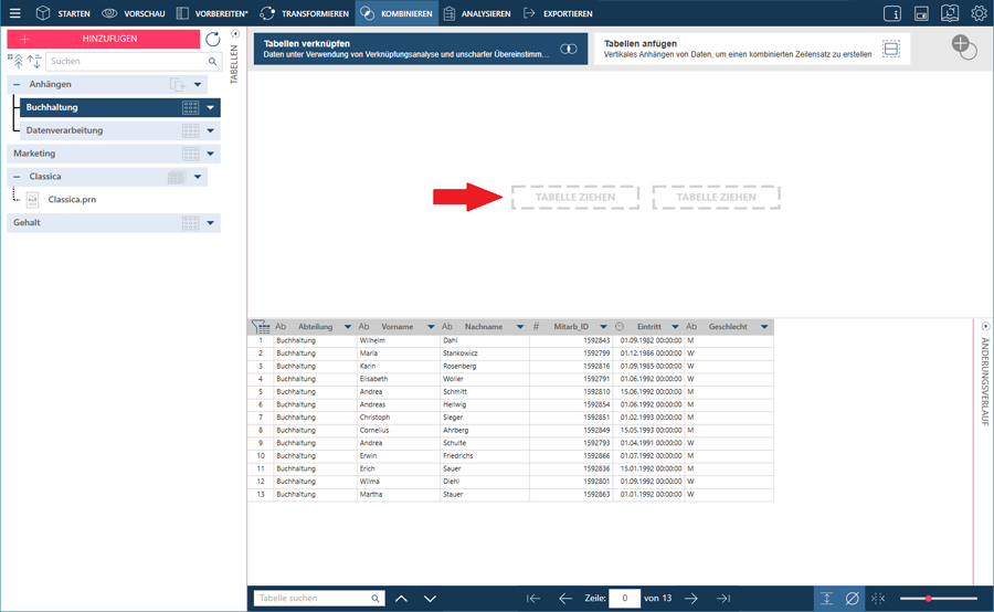 Die Phase „Kombinieren“ ermöglicht das Erstellen von Verknüpfungen zweier Tabellen in einer einzigen Verknüpfungssitzung. Verknüpfen Sie zwei oder mehr Tabellen, wenn Sie die Datensätze der beiden Tabellen zu einer Tabelle zusammenfassen möchten. Verknüpfungen ermöglichen das Konsolidieren von Daten und damit einen umfassenderen Überblick über die darin enthaltenen Informationen.