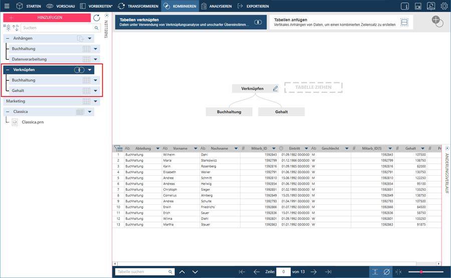 Klicken Sie nach dem Laden der Daten in das Fenster Vorbereiten auf Kombinieren > Verknüpfen, um die Verknüpfungsphase zu aktivieren.