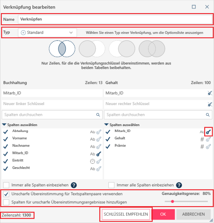 Beachten Sie bitte, dass unscharfe Verknüpfungen nur bei Schlüsselwerten mit dem Datentyp „Text“ funktionieren.