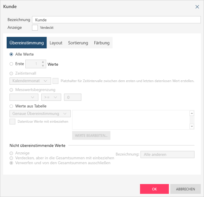 Kreuzen Sie im Feld Anzeigen das Kontrollkästchen Verdeckt an, wenn Sie das entsprechende Messwertfeld ausblenden möchten. Ein verdeckter Messwert kann aber trotzdem noch zu Sortierzwecken verwendet werden. Trotz Verdeckung einer Messwertspalte würde sich der betreffende Messwert aber weiter in gewisser Hinsicht auswirken. Die für einen verdeckten Messwert angegebenen Leerzeilen oder Zwischensummenzeilen würden beispielsweise weiterhin in de Summierung erscheinen. Hinweis: Verdeckte Spalten werden nicht mit exportiert.