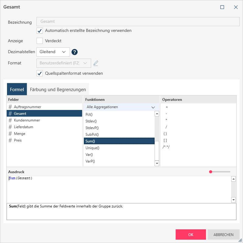 Beachten Sie bitte, dass das Ändern von Feldnamen in der Summierungsanzeige tatsächlich lediglich eine Änderung der Titel bewirkt. Im Dialogfeld Hinzufügen/Bearbeiten werden weiterhin die Originalnamen der Quellenfelder verwendet, nur die Summierungsanzeige zeigt die geänderten Titel an.