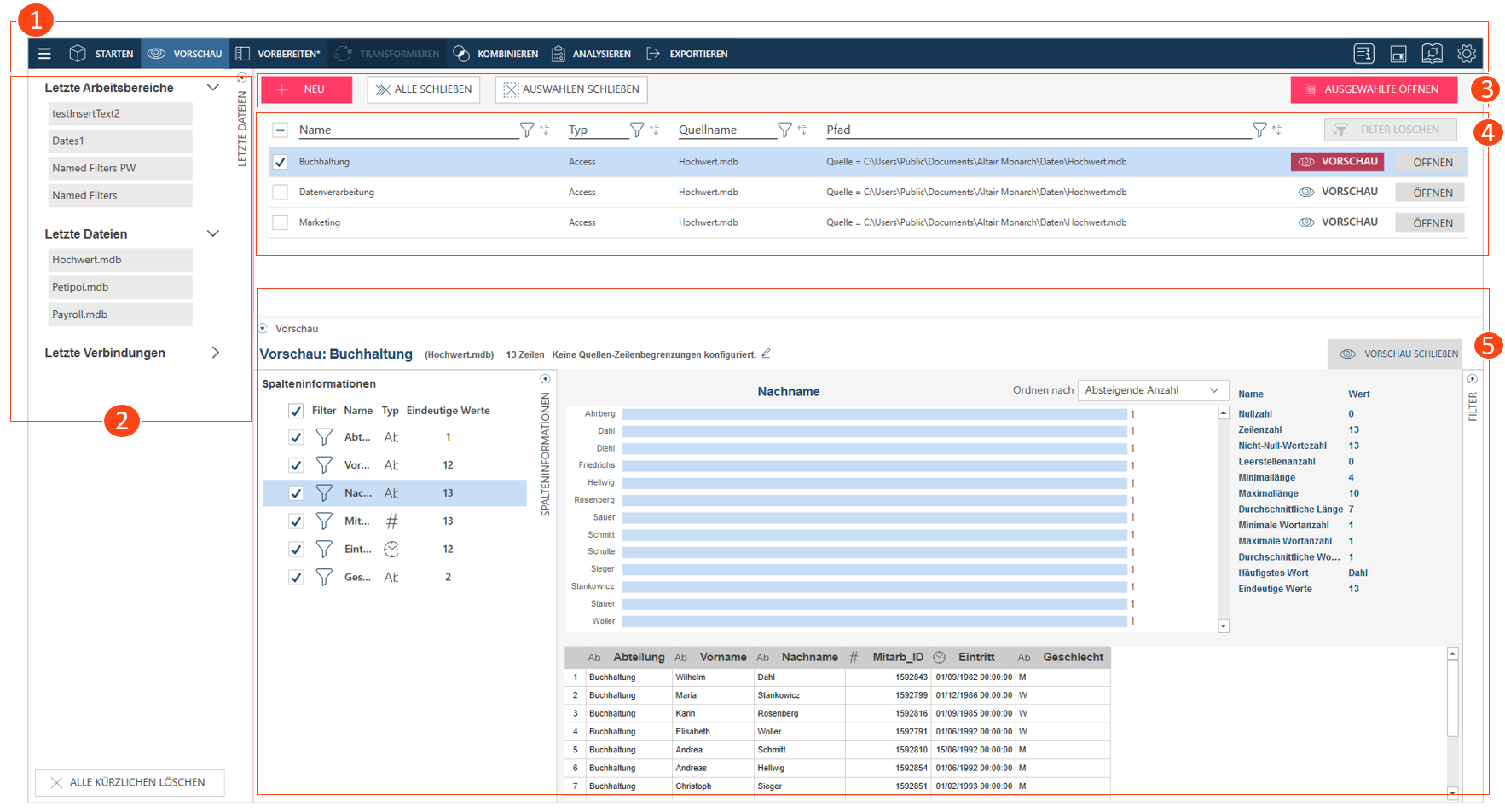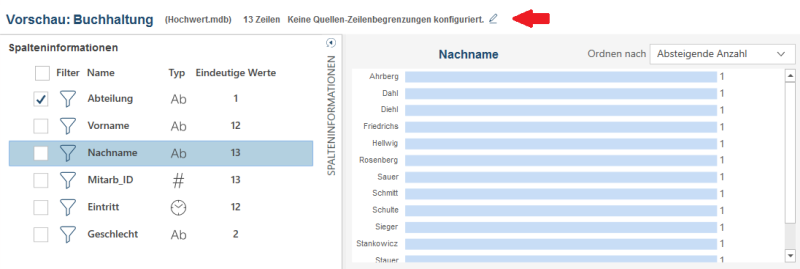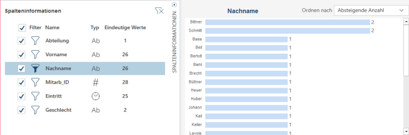 Spaltenstatistiken Durch Auswahl eines Spaltennamens im Fensterbereich „Spalteninformationen“ werden alle eindeutigen Werte dieser Spalte sowie verschiedene Statistiken je nach Datentyp im Fensterbereich „Spaltenstatistiken“ angezeigt.