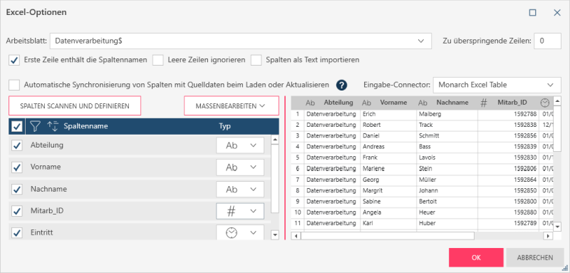 Datenvorschau Der Fensterbereich „Datenvorschau“ zeigt Beispielzeilen aus der ausgewählten Tabelle an. In diesem Fensterbereich können Sie visuell überprüfen, ob die von Ihnen benötigten Daten in der von Ihnen ausgewählten Tabelle enthalten sind. Die Symbole in der Kopfzeile geben über den Datentyp in der Spalte Auskunft: