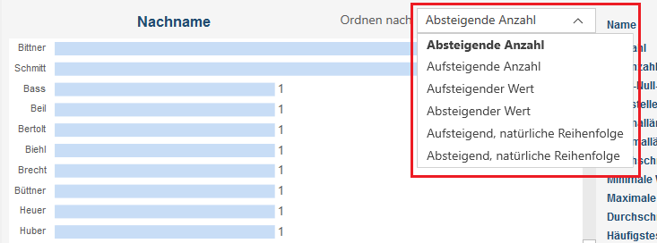 Wenn Sie die Zeilen einer ausgewählten Spalte statistisch sortieren möchten, wählen Sie eine Option aus der Liste Sortieren nach aus: