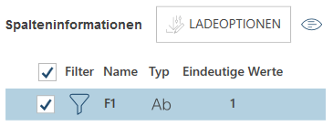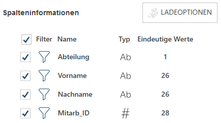 Spalteninformationen Dieser Fensterbereich zeigt eine Liste der Spalten in der Tabelle, die sich aktuelle in der Vorschau befinden. Er zeigt die Spaltennamen, den Datentyp jeder Spalte und die Anzahl der eindeutigen Werte für jede Spalte. Beachten Sie Folgendes: Wenn Sie beispielsweise eine Excel-Datei in der Vorschau anzeigen, wählen Sie Ladeoptionen aus, um die Excel-Optionen anzuzeigen und zu ändern.