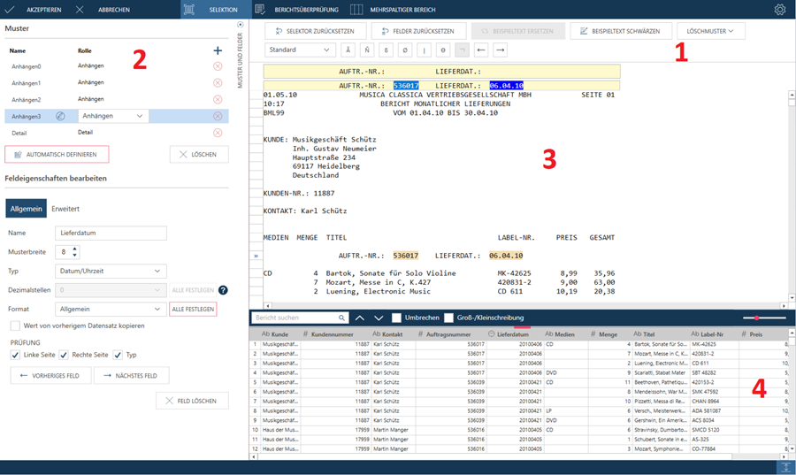 Zeigt das Dokument an, das als Grundlage für das Erstellen von Selektoren verwendet wird. Wenn Sie an einer Stelle in diesem Fensterbereich rechtsklicken, wird ein Menü eingeblendet, mit dem Sie ein Muster erstellen, Beispieltext ersetzen oder Text kopieren können. |