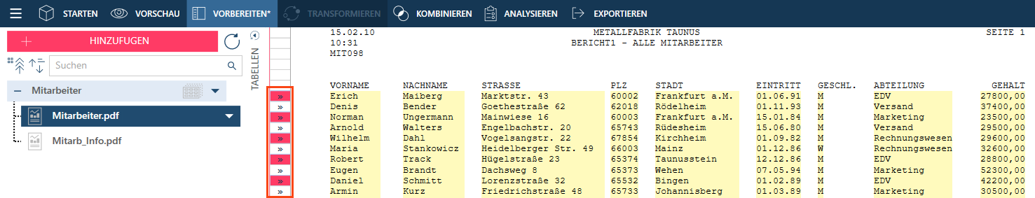 PDF- oder Berichtsdokumente, die in Data Prep Studio über den Berichtsentwurf geöffnet wurden, werden im Fenster „Vorbereiten“ als Monarch-Knoten angezeigt.