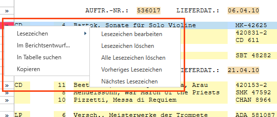 Klicken Sie mit der rechten Maustaste auf einer Zeile und wählen Sie aus dem Kontextmenü den Befehl Lesezeichen hinzufügen aus.