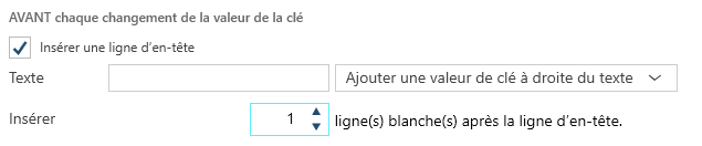 Dans l’onglet Mise en page, allez à la section AVANT chaque changement de la valeur de la clé, cochez la case Insérer une ligne d’en-tête, puis saisissez une valeur numérique dans Insérer n ligne(s) blanche(s) après la ligne d’en-tête pour spécifier le nombre de lignes blanches à ajouter après la ligne d’en-tête.