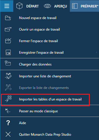 Cliquez sur l’icône du menu d’application en haut à gauche de l’écran, puis sélectionnez Importer les tables d’un espace de travail dans les options qui s’affichent.