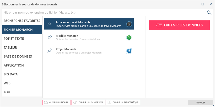 Vous pouvez aussi, sur la page Départ ou dans la fenêtre Aperçu ou Préparer, sélectionner Ouvrir les données (sur la page Départ), Nouveau (dans la fenêtre Aperçu ou Ajouter (dans la fenêtre Préparer) pour ouvrir la boîte de dialogue Sélectionner la source de données à ouvrir. Dans cette boîte de dialogue, sélectionnez Fichier Monarch > Espace de travail Monarch > Obtenir les données.