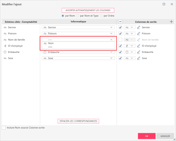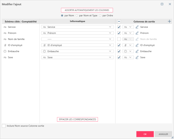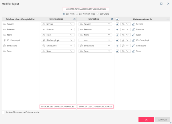 Assortir automatiquement les colonnes vous aidera à définir votre concaténation en faisant correspondre ou assortissant es colonnes en fonction des critères que vous sélectionnez (par Nom, par Nom et type ou par Ordre). Vous trouverez des exemples de ces types d’assortiment ici.
