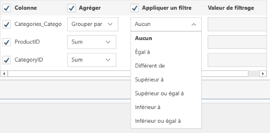 Si vous souhaitez que les données renvoyées soient regroupées, cochez la case Agréger dans l’en-tête, puis sélectionnez la méthode de regroupement que vous voulez utiliser pour chaque colonne. Les méthodes d’agrégation suivantes sont possibles pour chaque type de données :