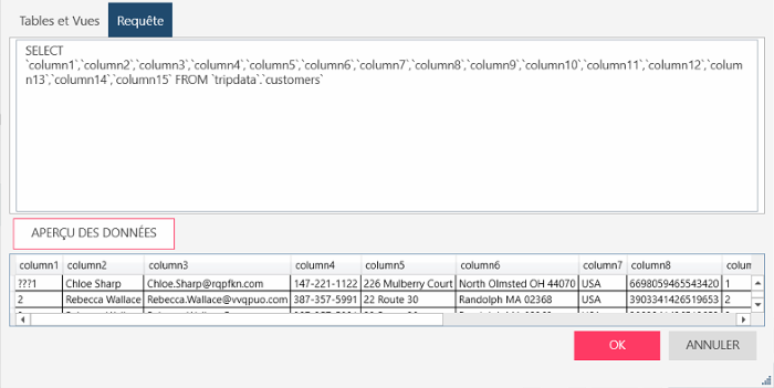Cliquez pour récupérer les données en utilisant les informations d’identification et les critères que vous avez spécifiés. Cela vous permet de confirmer votre connexion, de vérifier que vous êtes connecté à la bonne table, et de valider votre requête et ainsi que les informations qui seront chargées. Remarques :