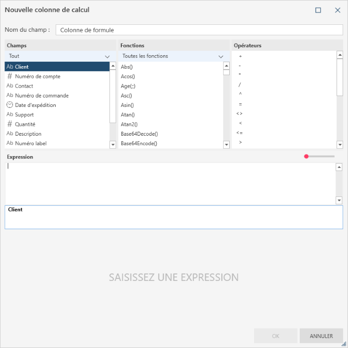 Sélectionnez les champs, les opérateurs et les fonctions depuis les listes figurant au-dessus du Générateur d’expressions.