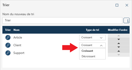 Après avoir chargé la liste des colonnes de tri, définissez le type de tri de chaque colonne en choisissant Croissant ou Décroissant dans la liste déroulante Type de tri de chaque colonne.
