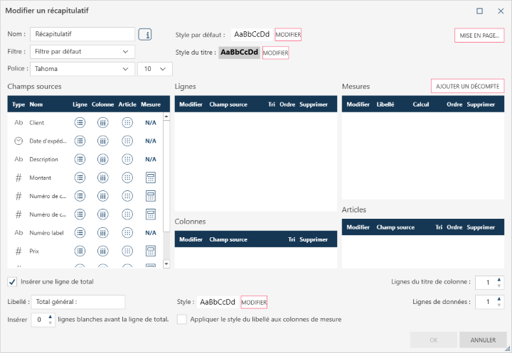 Style par défaut : Les paramètres spécifiés ici s’appliquent à toutes les lignes du récapitulatif, à l’exception de la ligne de titre et de totalisation.