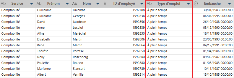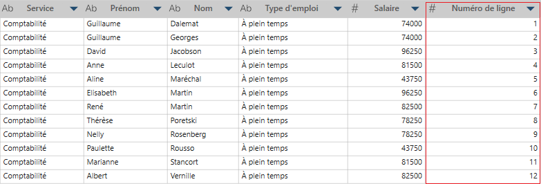 Cliquez avec le bouton droit sur une colonne, puis sélectionnez Colonne > Nouvelle colonne à numéro de ligne. La nouvelle colonne est automatiquement générée à la fin de la table. Vous pouvez changer de position cette colonne en la plaçant là où vous le souhaitez. Notez que lorsque cette nouvelle colonne avec des numéros de ligne est modifiée, la fonction utilisée pour créer les numéros de ligne est Recno. Il s’agit d’un problème connu.