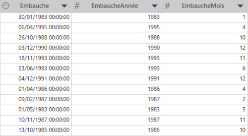 Dans cet exemple, Embauche est la colonne date/heure d’origine. Nous avons fractionné cette colonne en deux colonnes, en fonction de l’année et du mois pour obtenir EmbaucheAnnée et EmbaucheMois.