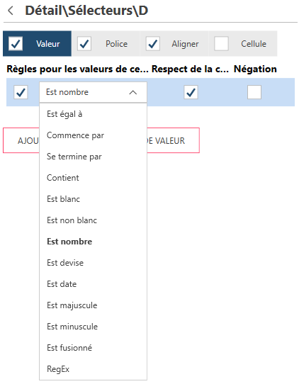L’onglet Valeur vous permet de définir les sélecteurs en fonction des valeurs dans une cellule. Les règles de valeur sont :