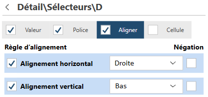 L’onglet Alignement vous permet de définir les sélecteurs en fonction des propriétés d’alignement.