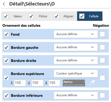 L’onglet Cellule vous permet de définir les sélecteurs en fonction des propriétés d’ornement des cellules.