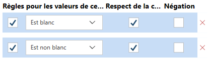 Respect de la casse pour garantir que les valeurs de texte sont appliquée dans le respect rigoureux de la casse. Par exemple, si votre valeur est Commence par « NORD » et que l’option de respect de la casse est sélectionnée, les valeurs qui commencent par « nord » sont ignorées.