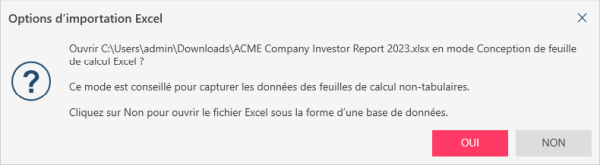 Faites glisser la feuille de calcul Excel dans Monarch Data Prep Studio et sélectionnez Oui dans la boîte de dialogue Options d’importation Excel qui apparaît :