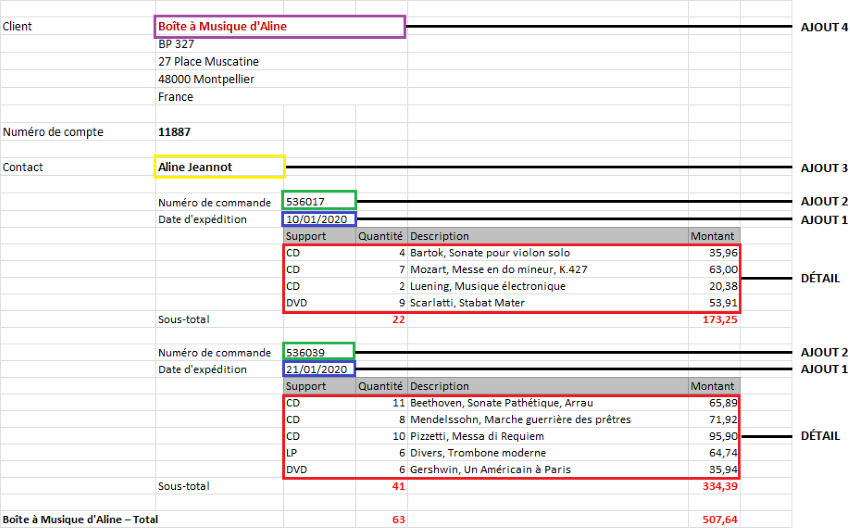 Vous pouvez, de plus, définir des masques pour les niveaux de tri supérieurs, appelés des masques d’ajout. Ces masques sont dits « d’ajout » car ils ajoutent des informations issues des niveaux de tri supérieurs à chaque enregistrement extrait au niveau de détail. Peu importe l’ordre de création des masques d’ajout nécessaires.