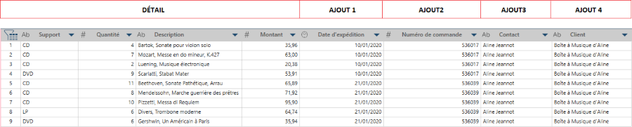 Les colonnes extraites au moyen d’un masque d’ajout s’associent à l’enregistrement de détail si le niveau d’ajout commence à la première ligne de détail ou avant. Les valeurs de colonne extraites s’ajoutent à tous les enregistrements de détail ultérieurs jusqu’à l’occurrence suivante de la colonne d’ajout dans l’état. Par exemple, dans l’illustration ci-dessus, un enregistrement de détail séparé est créé pour chaque transaction. Les colonnes de nom du client, contact et date d’expédition, extraites à l’aide de masques d’ajout, sont associées à la transaction en-dessous d’elles.