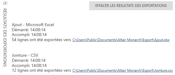 Vous pouvez effacer les résultats de toutes les exportations de ce panneau en cliquant sur le bouton Effacer les résultats des exportations en haut à droite du panneau.