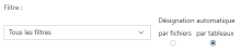 Si l’option Tous les filtres est sélectionnée, le paramètre de Désignation automatique doit être précisé :