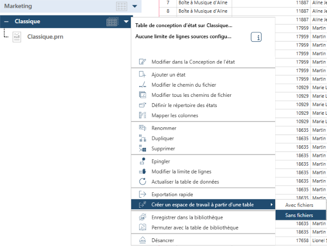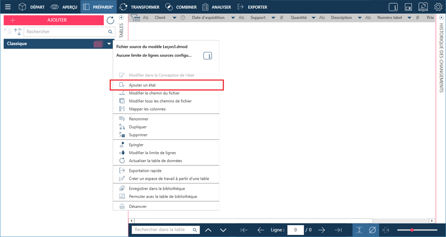 Dans la fenêtre Préparer, cliquez avec le bouton droit sur une table que vous voulez exporter vers un espace de travail depuis le sélecteur de table et choisissez Créer un espace de travail à partir d’une table dans les options qui s’affichent.