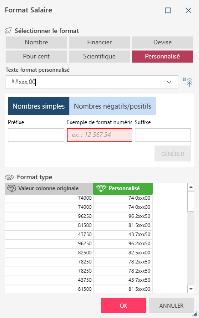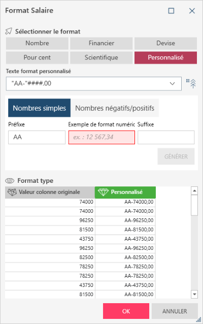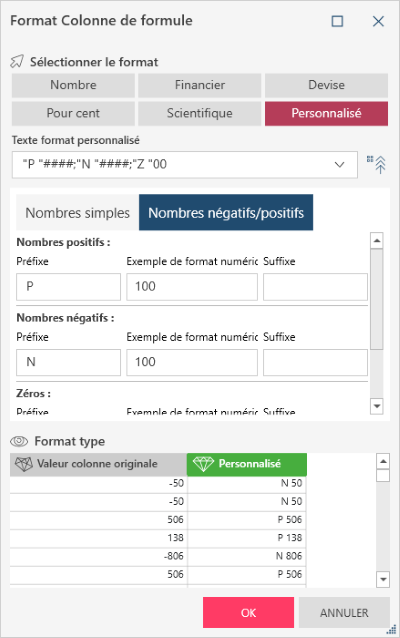 Pour formater des nombres positifs, négatifs ou égaux à zéro, vérifiez que l’onglet Nombres négatifs/positifs est sélectionné, puis spécifiez un exemple de format et le préfixe et/ou le suffixe de votre choix pour vos nombres positifs, négatifs ou égaux à zéro. Cliquez sur le bouton Générer pour produire un échantillon de l’aspect de vos nombres une fois le format sélectionné appliqué. Notez que le bouton Générer est désactivé quand vous n’avez pas spécifié de format personnalisé pour un type de nombre spécifique (positif, négatif et zéro) ou quand vous saisissez des caractères alpha ou spéciaux dans l’un des champs d’exemple Format numérique de cet onglet.