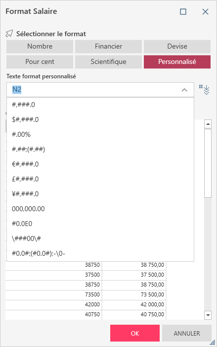 Sélectionnez l’un des formats prédéfinis (Nombre, Financier, Devise, Pourcentage, Scientifique) pour les appliquer à vos colonnes numériques. Vous pouvez aussi sélectionner Personnaliser pour définir votre propre formatage :