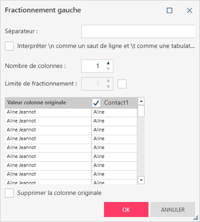 À partir du côté gauche, fractionne une colonne en deux colonnes ou plus, en fonction d’un séparateur défini par l’utilisateur. Le séparateur peut être un simple caractère ou une sous-chaîne.