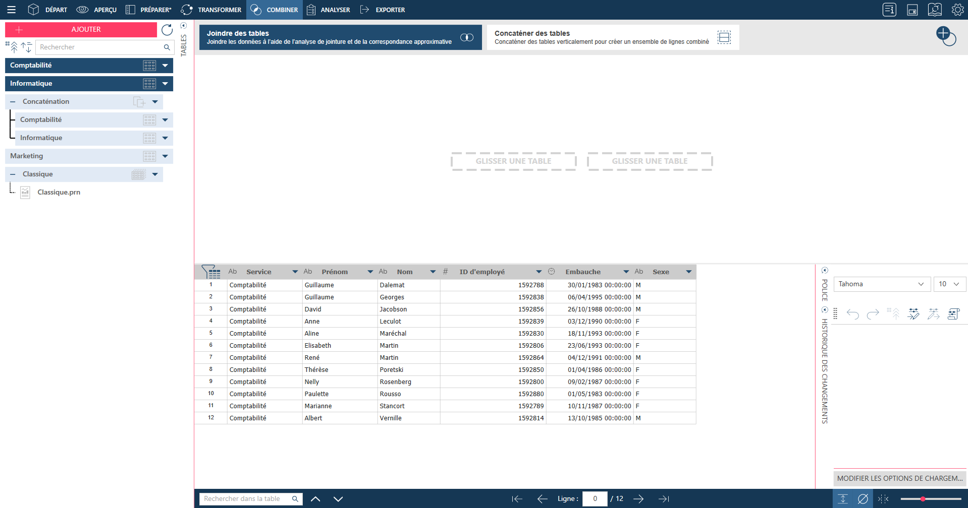 L’étape Combiner vous permet de créer des jointures à partir de deux tables en une seule session de jointure. Si vous souhaitez combiner les enregistrements de deux tables séparées, vous pouvez les joindre pour former une nouvelle table plus complète. Les jointures vous permettent de consolider vos données et d’offrir un affichage plus riche des informations qu’elles contiennent.