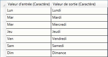 Saisissez une valeur de correspondance pour la valeur d'entrée correspondante. À titre d'exemple, si vous créez une table de recherche pour des valeurs abrégées de jours de la semaine, votre table ressemblera à ceci :