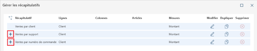 Chaque récapitulatif que vous avez créé s’affiche sur une ligne dans la boîte de dialogue. Si un récapitulatif contient plus d’une ligne, d’un élément ou d’une mesure, vous pouvez cliquer sur le bouton