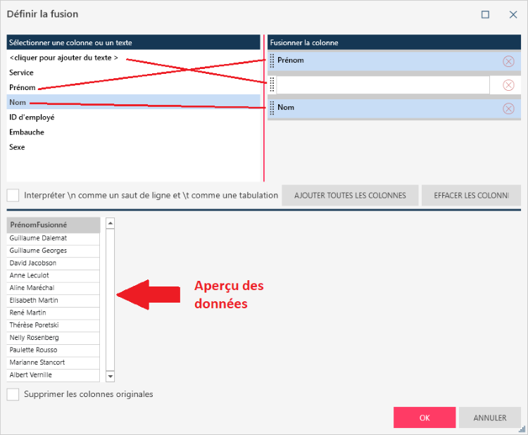 Cochez la case Supprimer les colonnes originales si vous voulez supprimez les colonnes d’origine (c.-à-d. non fusionnées) de la table résultante.