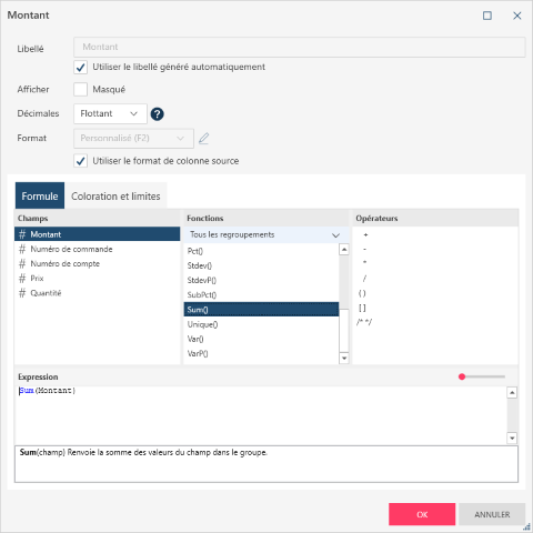 Si vous voulez modifier le calcul appliqué à ce champ de mesure, saisissez un nouveau calcul (par ex. une expression arbitraire impliquant addition, soustraction, multiplication et division des valeurs des colonnes numériques) dans le champ Expression.