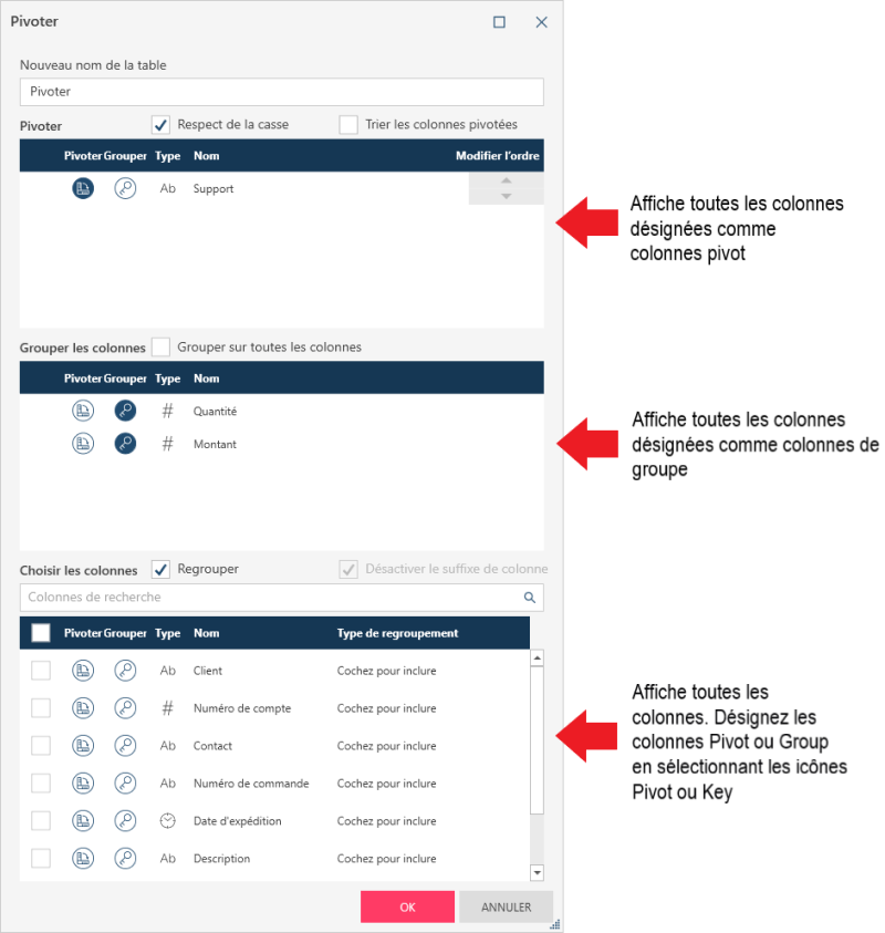 Pour modifier l’ordre des colonnes de pivotement, cliquez sur les flèches vers le haut ou vers le bas à côté de ces colonnes.