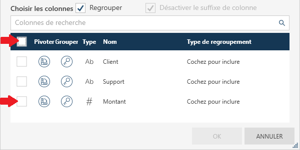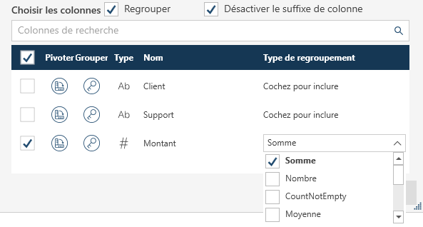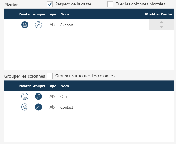 Pour faire de Client une colonne de pivotement au lieu d’une colonne de groupement, cliquez sur l’icône de pivotement qui se trouve à côté dans la section Grouper les colonnes.
