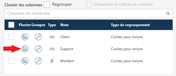 Pour sélectionner une colonne à pivoter, cliquez sur l’icône pivoter en regard d’une colonne dans la section Choisir les colonnes de la boîte de dialogue.